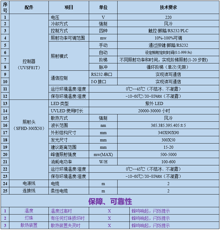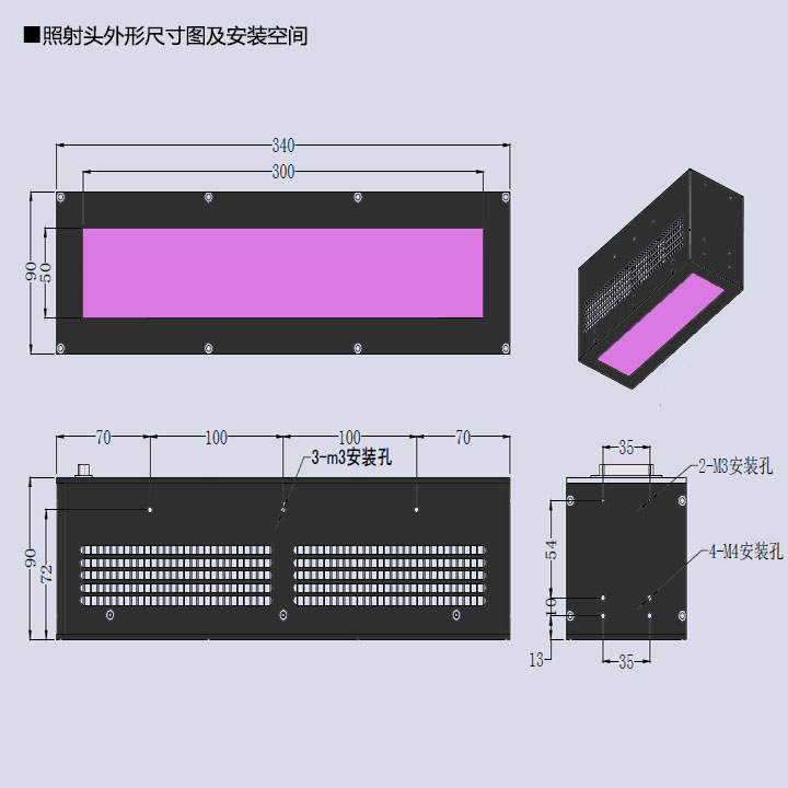 選型指導(dǎo):控制器+照射頭(1-4照射頭,標(biāo)準(zhǔn)品為30mm-200mm(長(zhǎng)度)30mm-200mm(寬度),可定制不同波段,不同尺寸面光源)。