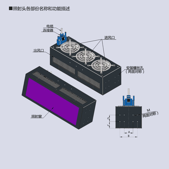 選型指導(dǎo):控制器+照射頭(1-4照射頭,標(biāo)準(zhǔn)品為30mm-200mm(長(zhǎng)度)30mm-200mm(寬度),可定制不同波段,不同尺寸面光源)。